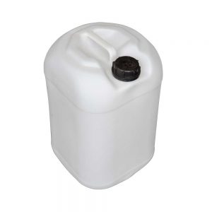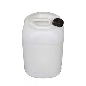 25 ltr plastic jerry’s with black bung screw cap, handle to top. UN approved