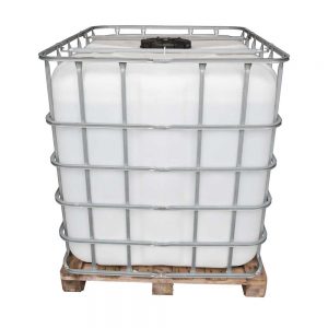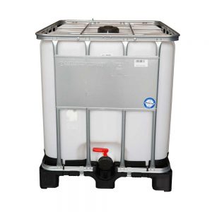 1000 ltr IBC container with 3” outlet valve. Steel frame and plastic pallet base. Food grade